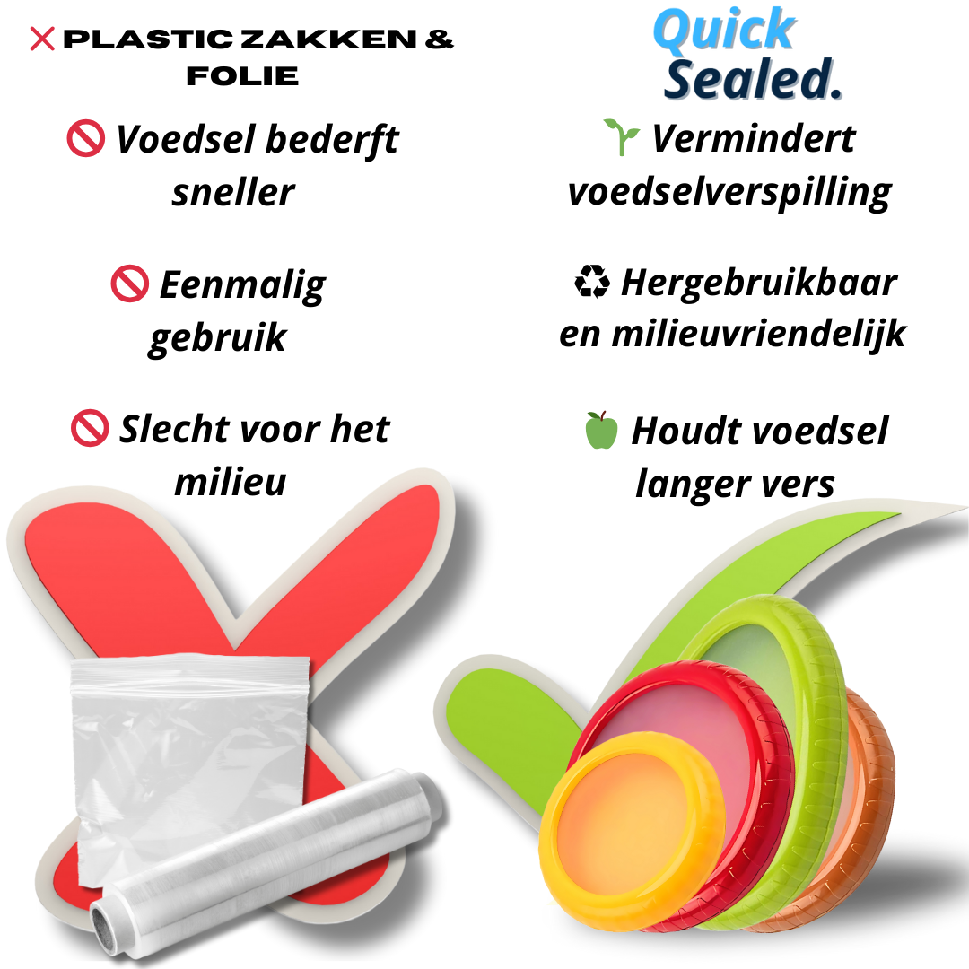 Weg met wegwerpplastic! Traditionele plastic zakken en folie zijn slecht voor het milieu. QuickSealed biedt een herbruikbare en milieuvriendelijke oplossing die je eten langer vers houdt. Bespaar geld, verminder afval en geniet van verse producten.